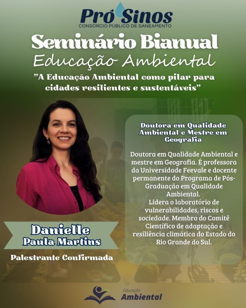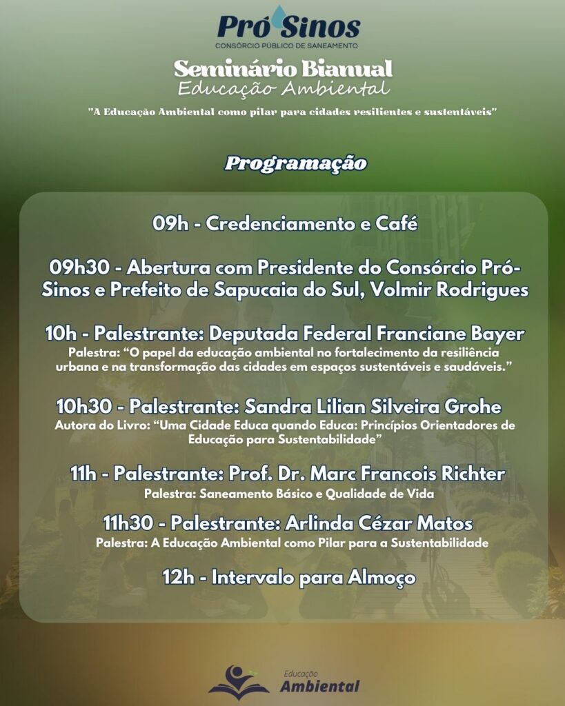 Promovido pelo Consórcio Pró-Sinos, por meio do Programa Permanente de Educação Ambiental (PPEA), o seminário busca discutir os principais desafios ambientais enfrentados pelas cidades e refletir sobre o papel da educação ambiental na construção de comunidades mais sustentáveis, seguras e preparadas para os efeitos das mudanças climáticas.
