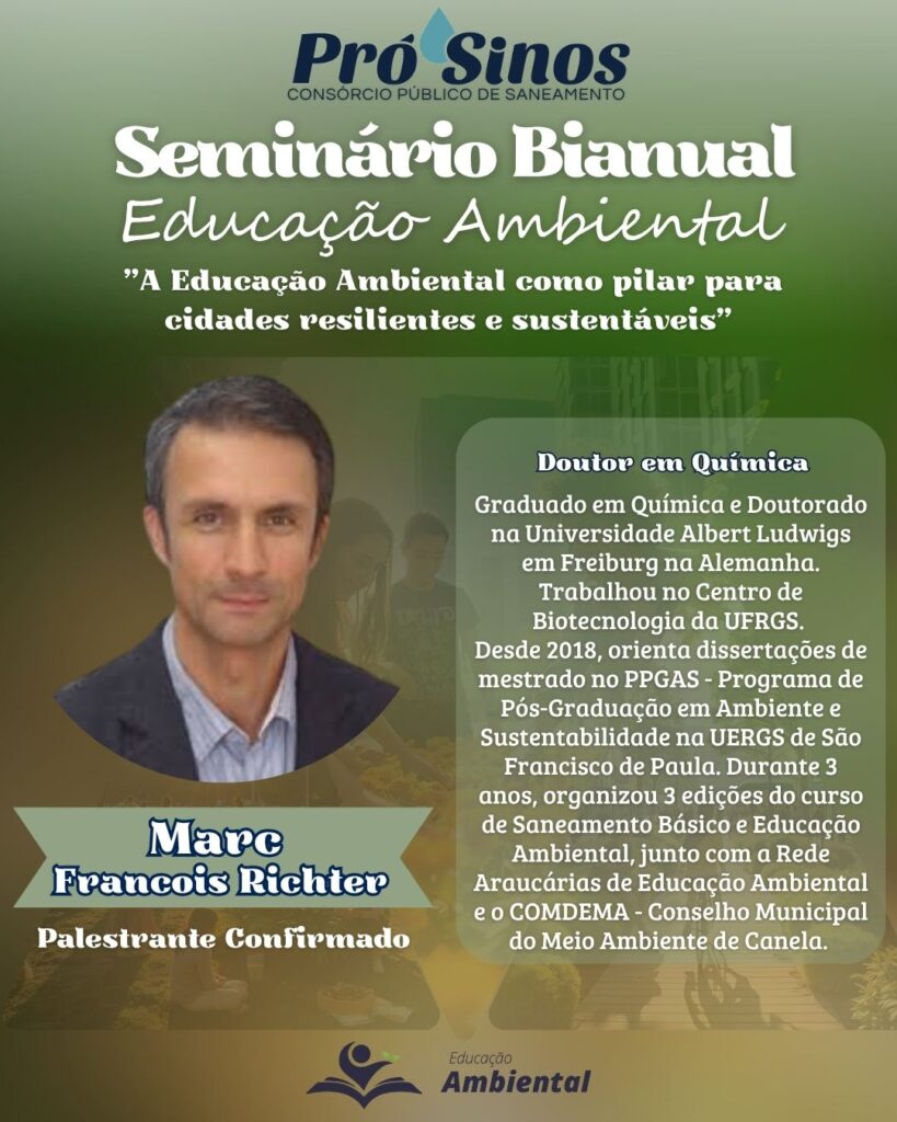 Painelista: Prof. Dr. Marc Francois Richter – Graduado em Química – Doutor em Bioquímica – Professor da Uergs (2003) – orientador de mestrado no PPGAS – Programa de Pós-Graduação em Ambiente e Sustentabilidade (2018), organizador do curso de Saneamento Básico e Educação Ambiental junto à rede Araucárias de Educação Ambiental e o COMDEMA.