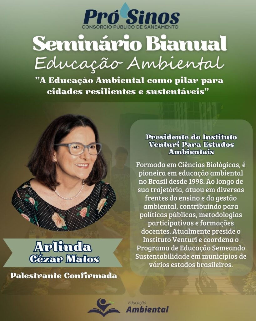 Painelista: Arlinda Cézar Matos – Presidente do Instituto Venturi para Estudos Ambientais, formação em Ciências Biológicas, é pioneira em Educação Ambiental no Brasil desde 1998. Com passagem pela University of California, Berkeley e Davis, retornou ao Brasil determinada a fortalecer a presença da educação ambiental nas escolas públicas.